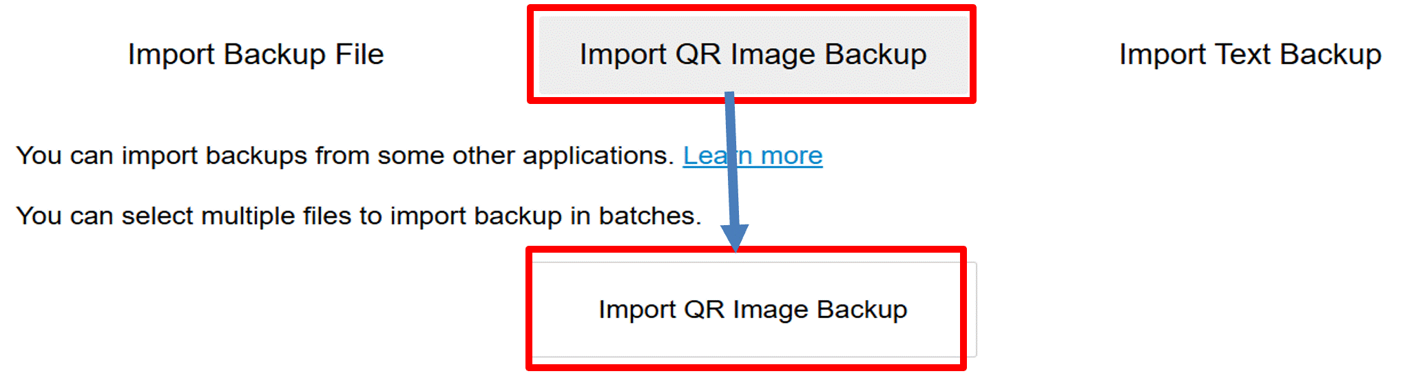 C "When the following screen appears, click 'Import QR Image Backup,' select the saved QR image, and import it.