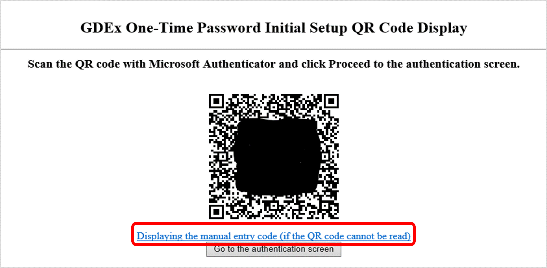 (3) When the GDEx one-time password initial setup QR code display screen appears, scan it using the authentication software on the PC.